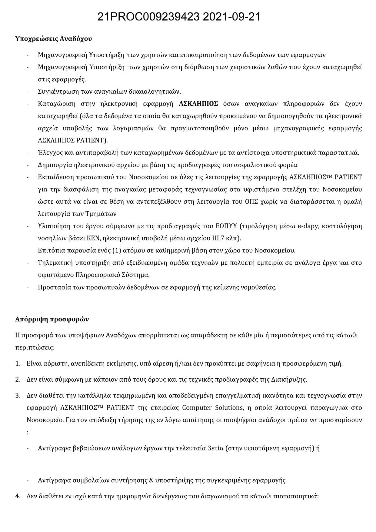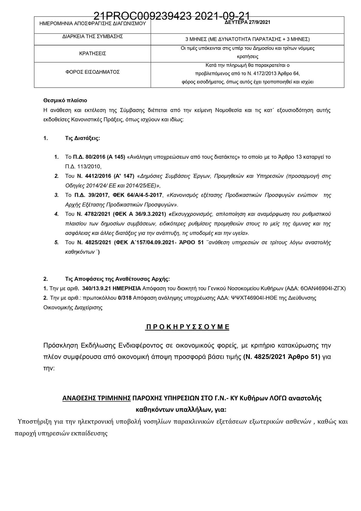 Πρόσκληση εκδήλωσης ενδιαφέροντος για την υποβολή προσφορών 3μηνης παροχής υπηρεσιών υποστήριξης για την ηλεκτρονική υποβολή νοσηλίων και παρακλινικών εξετάσεων εξωτερικών ασθενών για το γραφείο κίνησης.